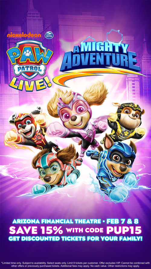 Paw Patrol Live! A Mighty Adventure is racing into Phoenix for two action-packed shows your little ones will never forget. Save 15% off on your tickets with the code PUP15 on their website at https://www.pawpatrollive.com/